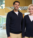 50% merino wool/50% cotton. Set in sleeves.Ribbed collar, cuffs and hem.Double contrast taped neck.YKK zip neck.Machine washable.